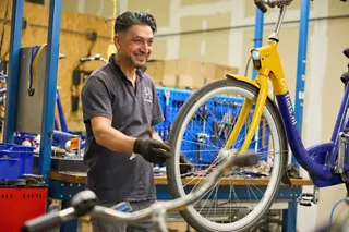 Kunnen we een OV-fiets zelf niet meer repareren? Dan brengen we hem naar de sociale fietsenfabriek van Roetz. Daar halen fietsenmakers de fiets volledig uit elkaar: tot meer dan honderd losse onderdelen. Al die onderdelen worden zorgvuldig gesorteerd.